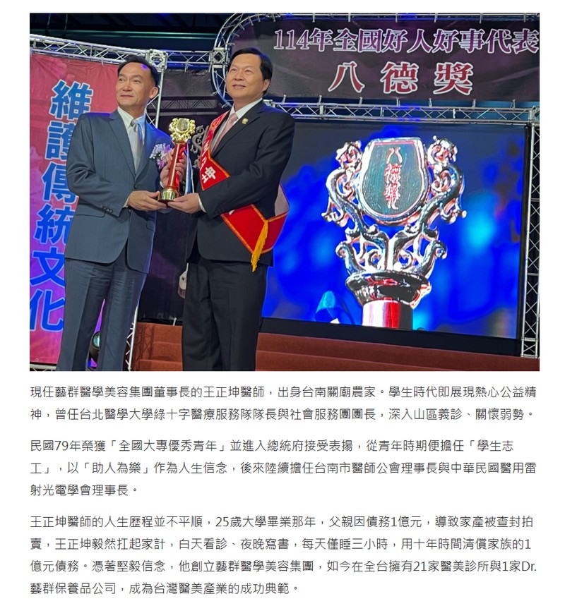 中華民國表揚好人好事運動協會主辦的114年全國好人好事代表「八德獎」頒獎典禮,12月10日在臺北市政府青年局舉行。王正坤醫師以長年深耕醫療公益、扶助弱勢及回饋教育的卓越事蹟,榮獲「八德獎」殊榮,成為全國醫界與企業界兼具的典範代表。