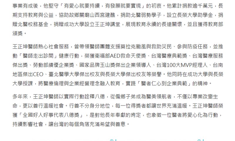 https://www.taiwanhot.net/news/focus/1122319/從學生志工到企業慈善家+王正坤醫師行善不輟榮獲全國好人好事「八德獎」/57/台南