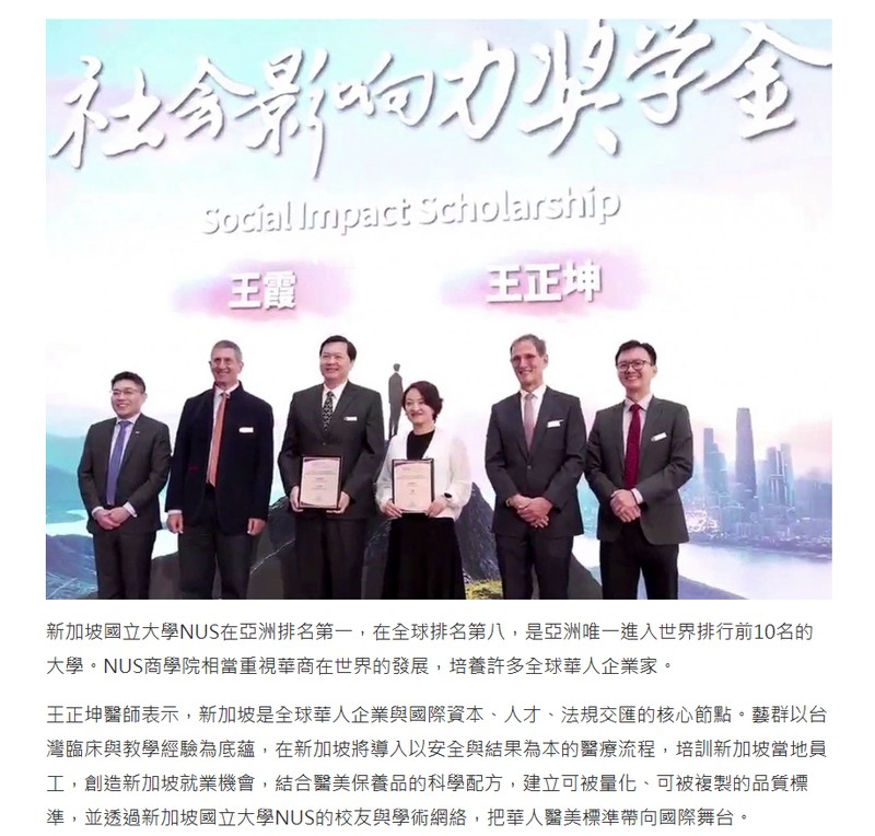 王正坤醫師榮膺新加坡國立大學EMBA「社會影響力獎學金 肯定長年深耕公益 -台灣好新聞