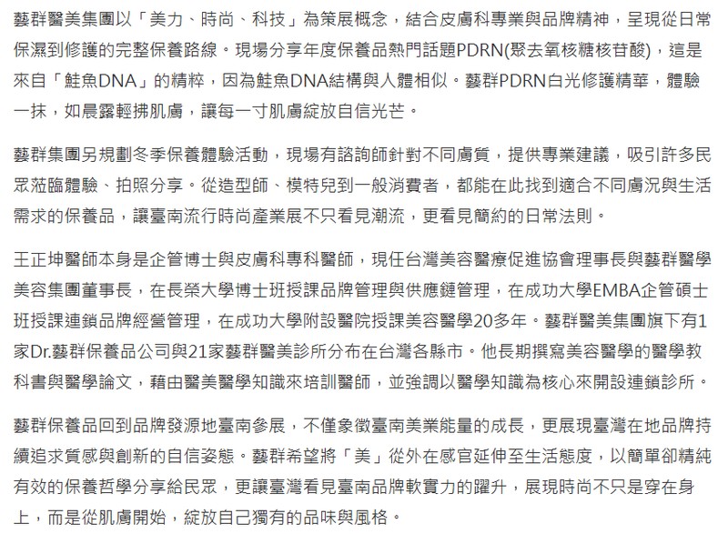 在眾多登場品牌中,Dr.藝群保養品備受關注。藝群醫美集團董事長王正坤醫師表示,品牌核心精神始終圍繞「清爽、高效、低負擔」三大理念,回應當代對減法保養與自然美學的需求。全球時尚趨勢逐漸回歸「自然光肌」與「極簡妝容」,而保養已不再只是日常程序,更是完整造型文化的一部分。真正的時尚,來自健康肌膚所散發的底蘊光澤,美業與時尚同樣需要長期研發、科學支撐與專業態度,才能打造屬於新時代的生活美學。