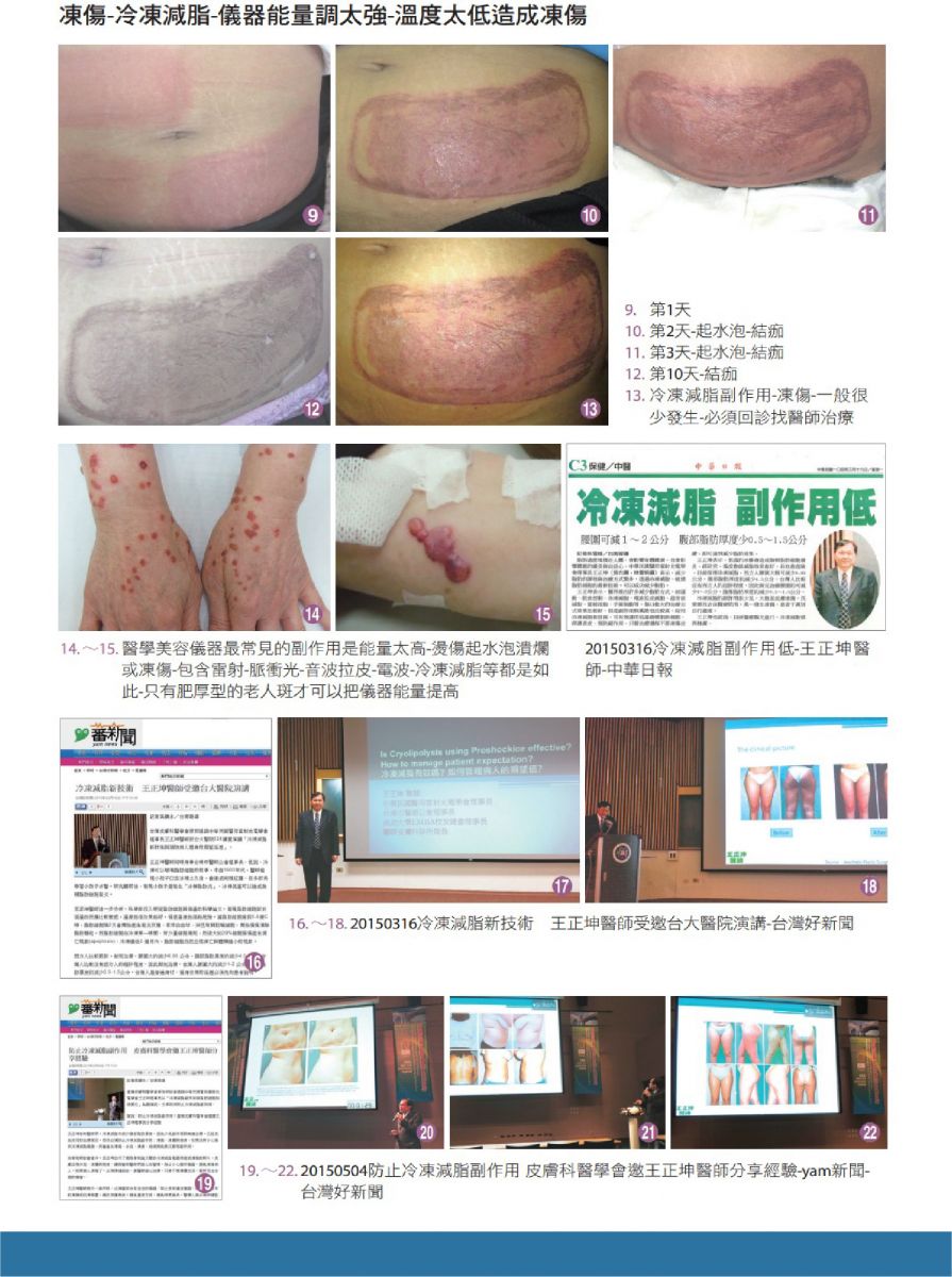 在學術研討會當中,王正坤出示了國際學術論文關於冷凍減脂儀器所造成凍傷的照 片,皮膚出現水泡、潰爛與疤痕,讓與會的醫師們都心生警惕,務必小心操作儀器,避免凍傷病人。如果病人凍傷了,必須持續回診,讓醫師細心治療,只要不要潰爛太深,都有完全治癒的機會。