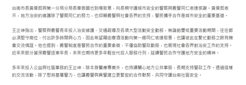 多年來投入公益與社區事務的王正坤,除本身醫療專業外,也持續關心地方公共事務,長期支持警政工作。透過這樣的交流活動,除了慰勞基層警力,也讓義警與員警建立更緊密的合作默契,共同守護台南社區安全。