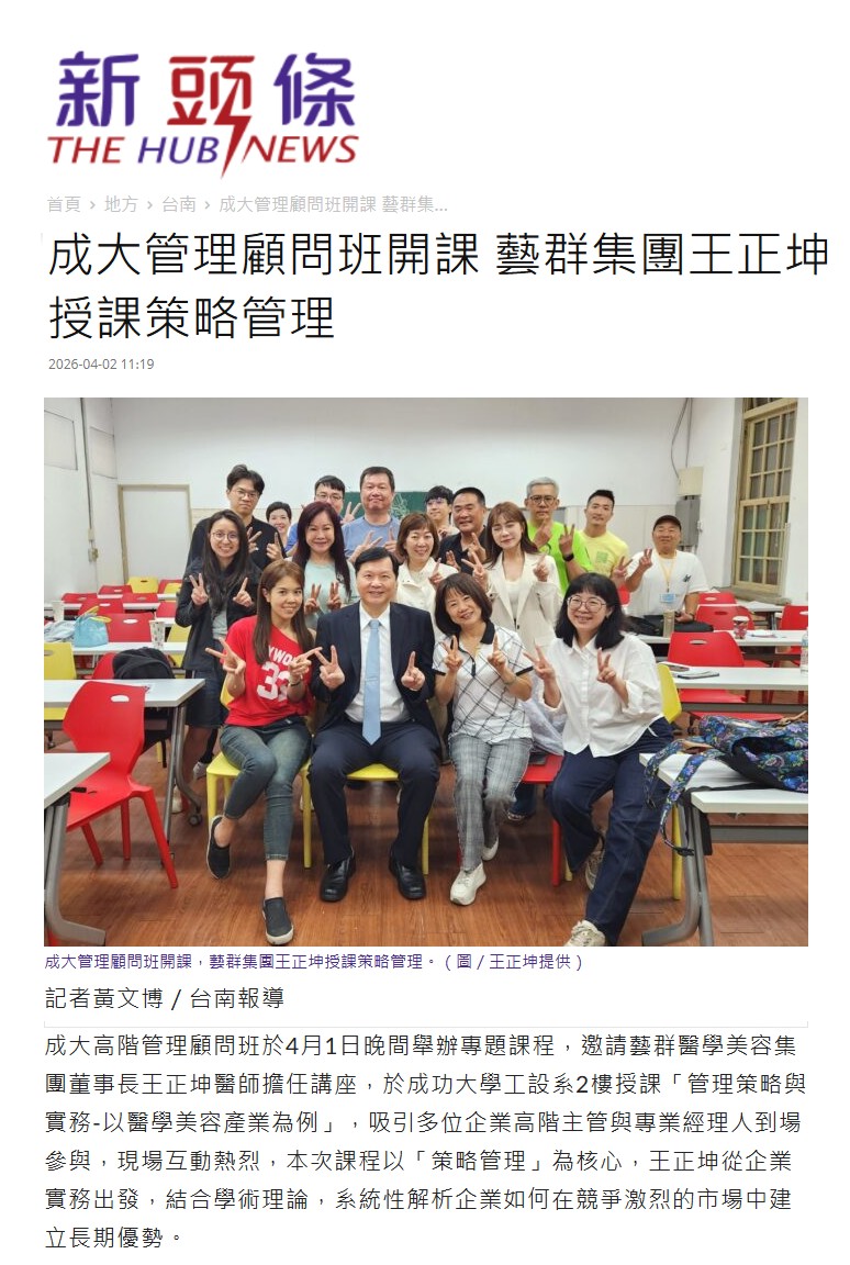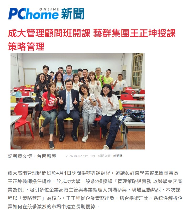 成大高階管理顧問班於4月1日晚間舉辦專題課程,邀請藝群醫學美容集團董事長王正坤醫師擔任講座,於成功大學工設系2樓授課「管理策略與實務-以醫學美容產業為例」,吸引多位企業高階主管與專業經理人到場參與,現場互動熱烈,本次課程以「策略管理」為核心,王正坤從企業實務出發,結合學術理論,系統性解析企業如何在競爭激烈的市場中建立長期優勢。