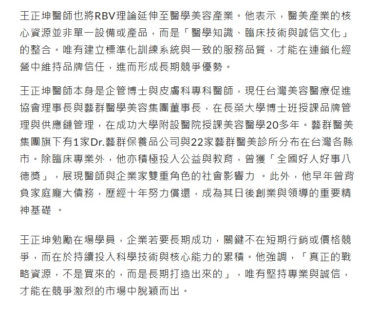 王正坤醫師也將RBV理論延伸至醫學美容產業。他表示,醫美產業的核心資源並非單一設備或產品,而是「醫學知識、臨床技術與誠信文化」的整合。唯有建立標準化訓練系統與一致的服務品質,才能在連鎖化經營中維持品牌信任,進而形成長期競爭優勢。