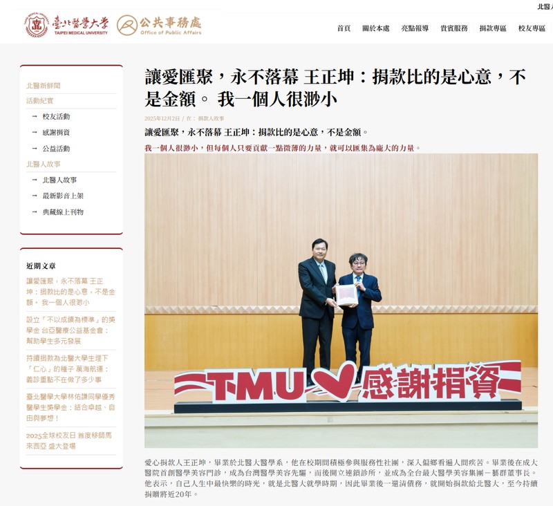 愛心捐款人王正坤,畢業於北醫大醫學系,他在校期間積極參與服務性社團,深入偏鄉看遍人間疾苦。畢業後在成大醫院首創醫學美容門診,成為台灣醫學美容先驅,而後開立連鎖診所,並成為全台最大醫學美容集團-藝群董事長。他表示,自己人生中最快樂的時光,就是北醫大就學時期,因此畢業後一還清債務,就開始捐款給北醫大,至今持續捐贈將近20年。