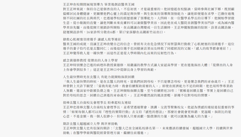 「我人生最快樂的時候,是在北醫大的時光。當我們回到母校,不只是懷念母校,更是懷念我們的青春歲月。」王正坤曾對上天許下願望:「當我有能力時,我會持續幫助需要的人。」即使在經濟能力不足的時期,他也用所學專業助人無數。還清家中鉅額負債之後,王正坤開始捐贈北醫,至今持續將近20年:「號稱是回饋北醫,事實上是回饋自己對於母校的思念,回饋自己消逝的青春歲月。」王正坤雖然說的風淡雲輕,卻掩不住對母校的情懷。