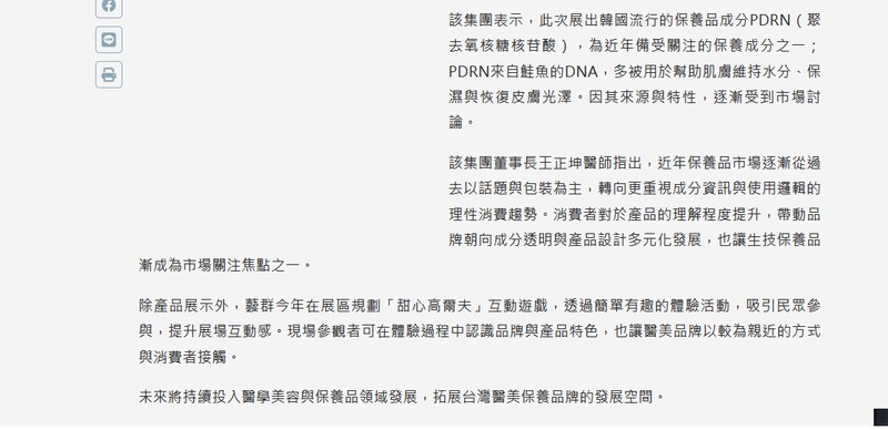該集團董事長王正坤醫師指出,近年保養品市場逐漸從過去以話題與包裝為主,轉向更重視成分資訊與使用邏輯的理性消費趨勢。消費者對於產品的理解程度提升,帶動品牌朝向成分透明與產品設計多元化發展,也讓生技保養品漸成為市場關注焦點之一。