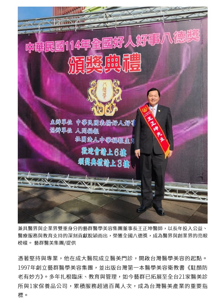 由中華民國表揚好人好事運動協會主辦的「114年全國好人好事代表八德獎」昨(10)日在臺北市政府青年局舉行。今年的得獎名單中,兼具醫界與企業界雙重身分的藝群醫學美容集團董事長王正坤醫師,以長年投入公益、醫療服務與教育支持的深刻貢獻脫穎而出,榮獲全國八德獎,成為醫界與創業界的亮眼榜樣。