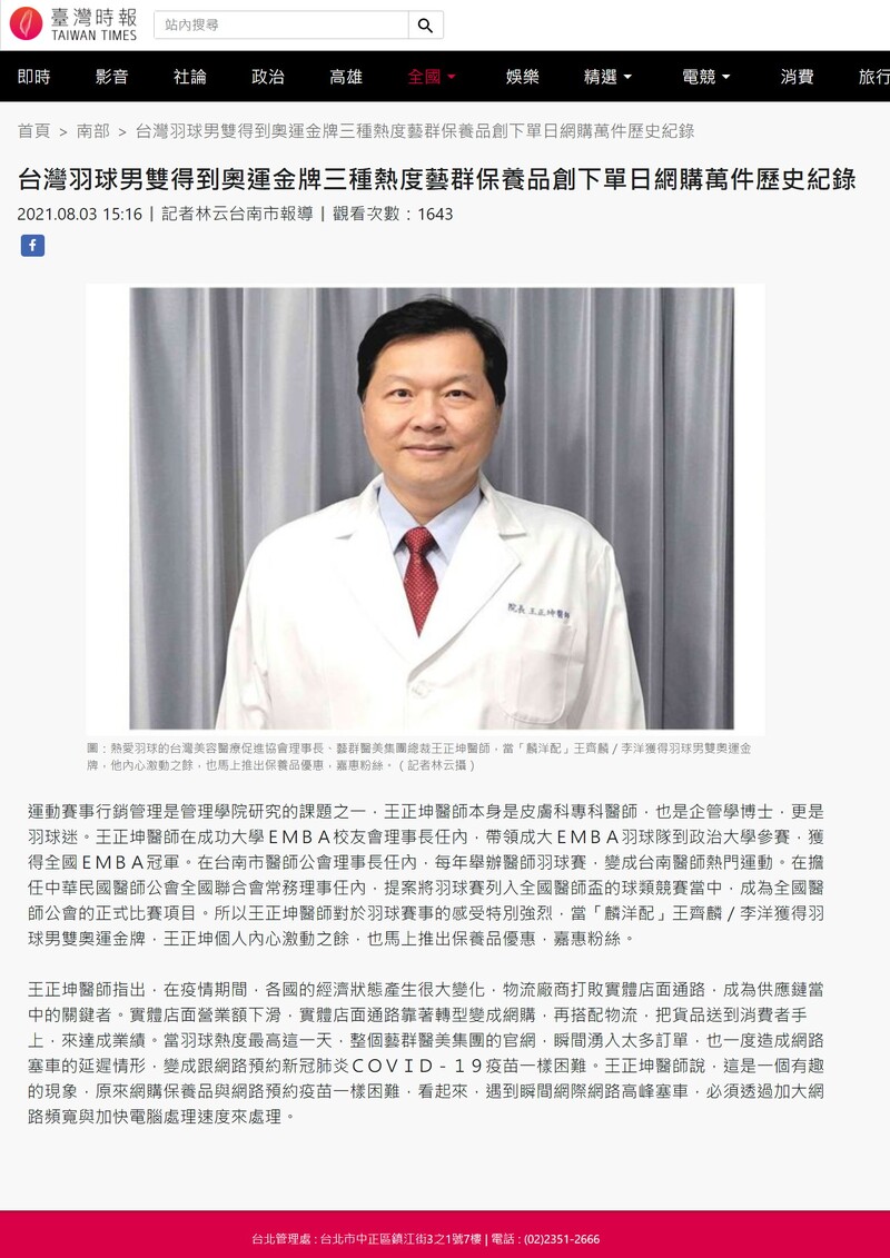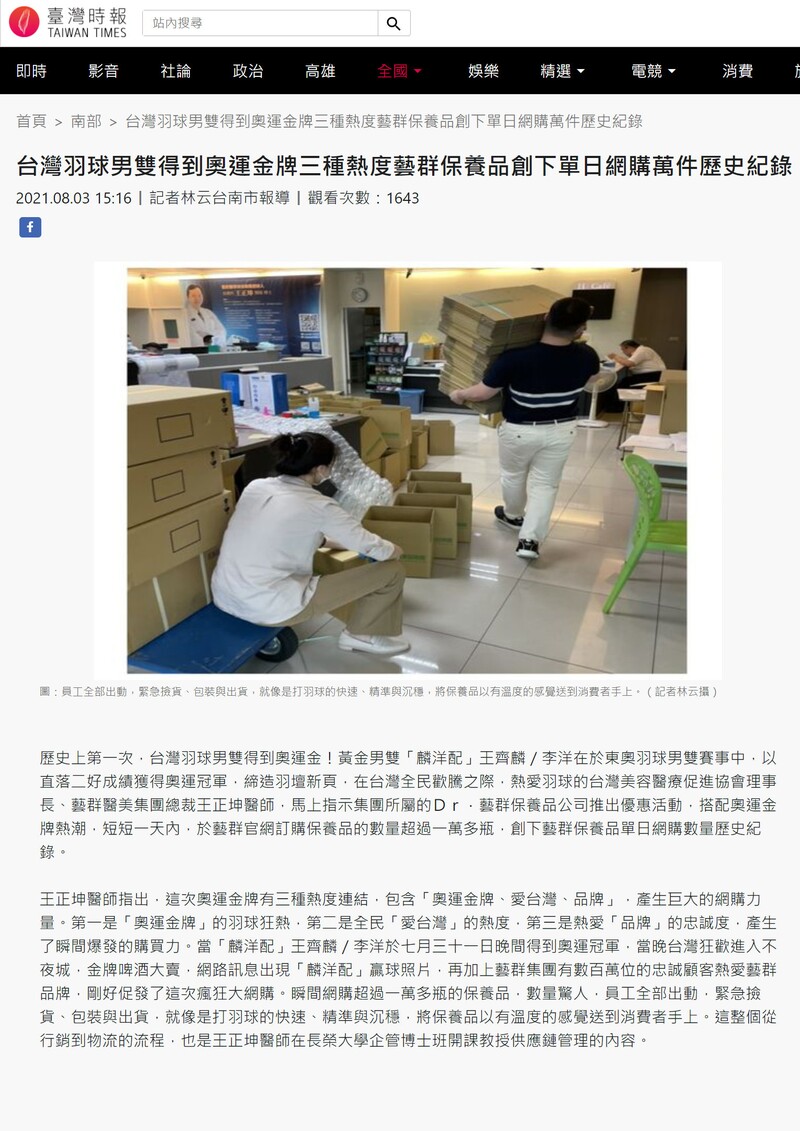 台灣羽球男雙得到奧運金牌三種熱度藝群保養品創下單日網購萬件歷史紀錄 台灣時報報導