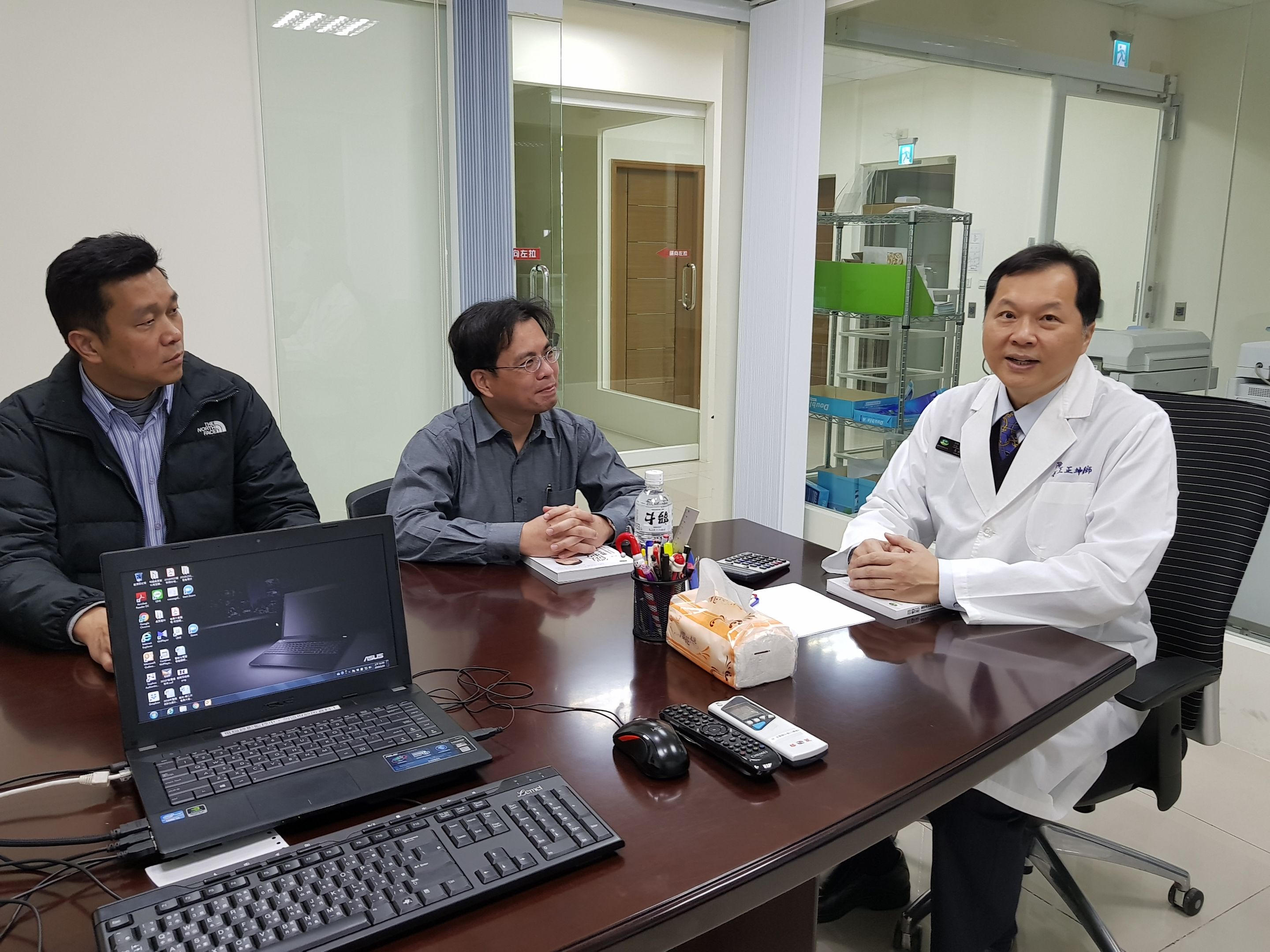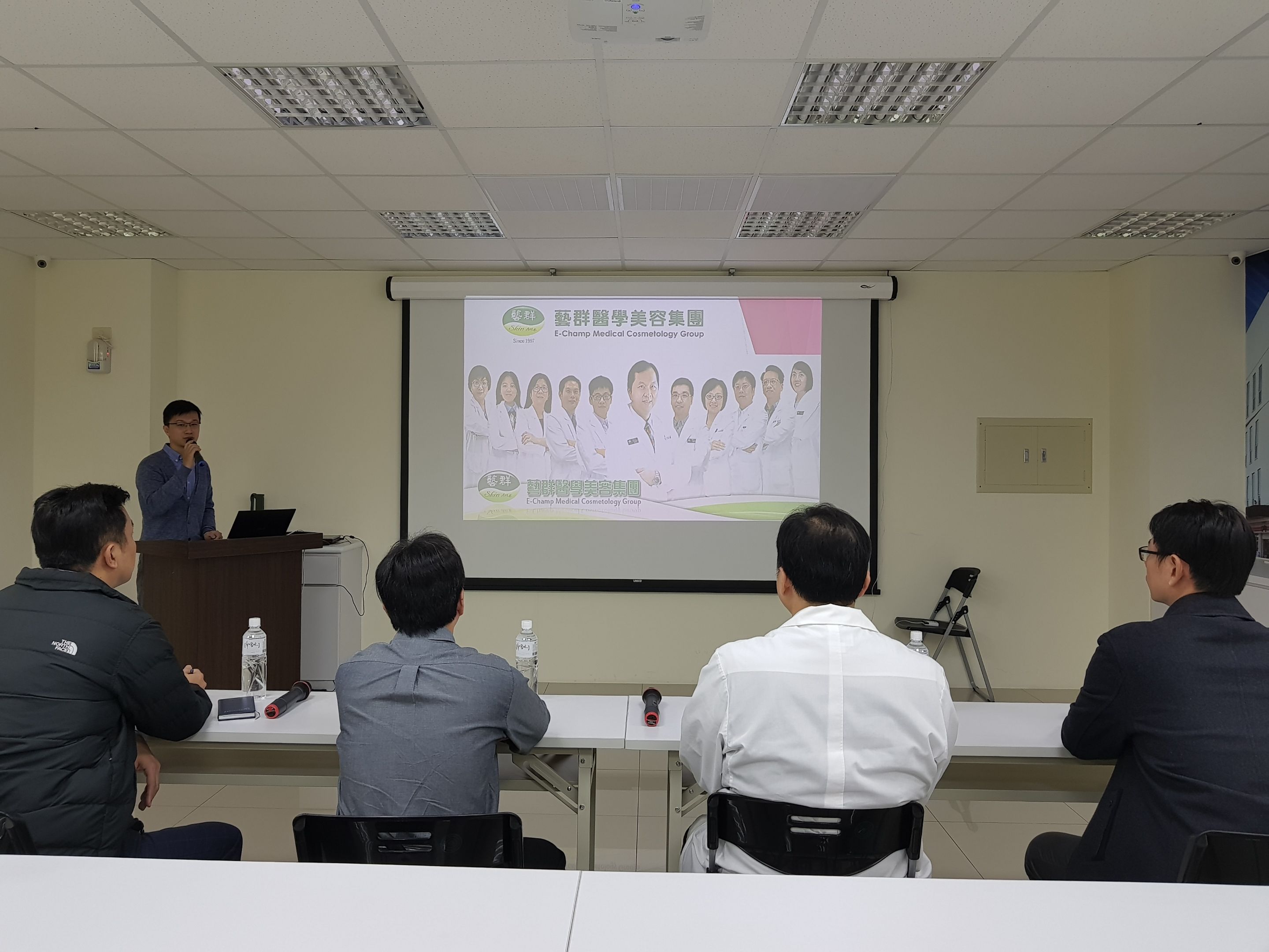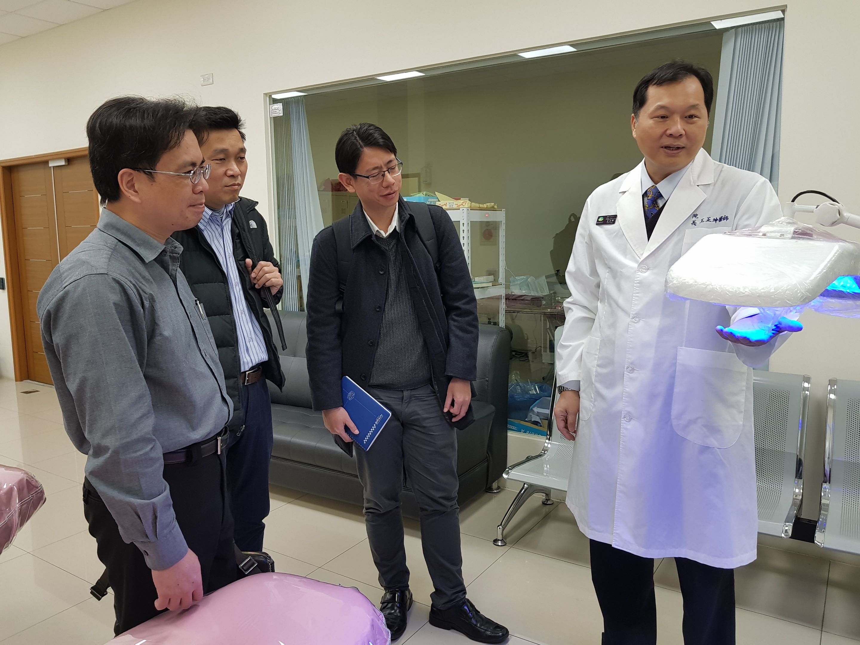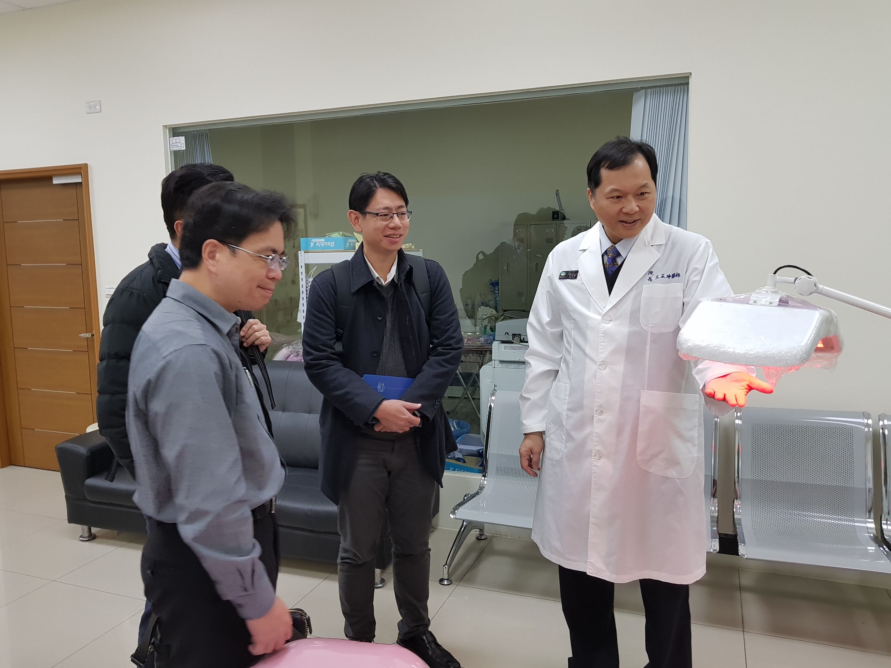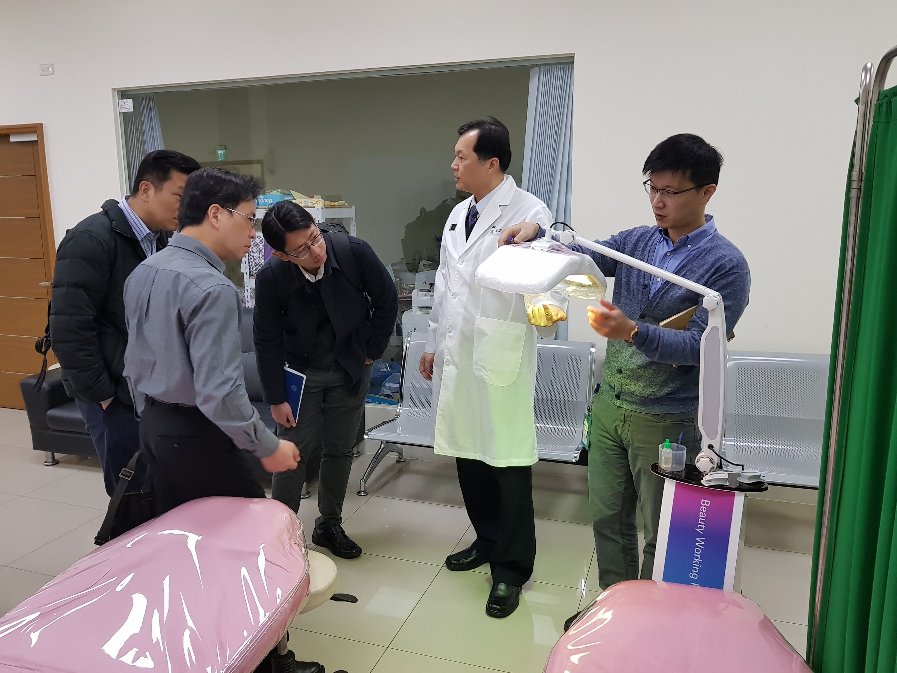 交通大學影像與生醫光電研究所林伯昰教授與晶元光電公司兩位研發處長,拜訪中華民國醫用雷射光電學會前理事長王正坤醫師,參觀藝群皮膚科診所多種雷射光電設備,試圖由醫師端與消費者端,發展台灣雷射光電產業。
