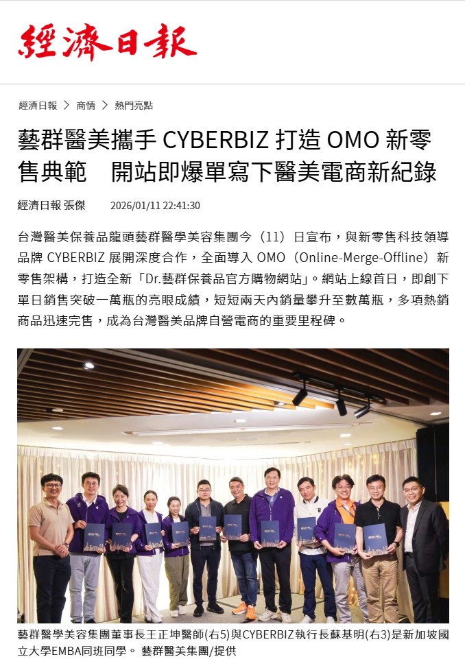 台灣醫美保養品龍頭藝群醫學美容集團今(11)日宣布,與新零售科技領導品牌 CYBERBIZ 展開深度合作,全面導入 OMO(Online-Merge-Offline)新零售架構,打造全新「Dr.藝群保養品官方購物網站」。網站上線首日,即創下單日銷售突破一萬瓶的亮眼成績,短短兩天內銷量攀升至數萬瓶,多項熱銷商品迅速完售,成為台灣醫美品牌自營電商的重要里程碑。
