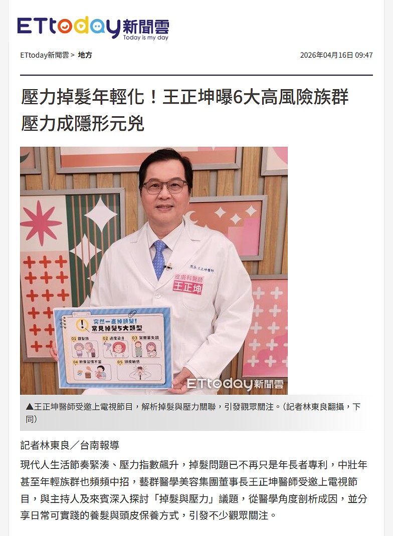 現代人生活節奏緊湊、壓力指數飆升,掉髮問題已不再只是年長者專利,中壯年甚至年輕族群也頻頻中招,藝群醫學美容集團董事長王正坤醫師受邀上電視節目,與主持人及來賓深入探討「掉髮與壓力」議題,從醫學角度剖析成因,並分享日常可實踐的養髮與頭皮保養方式,引發不少觀眾關注。