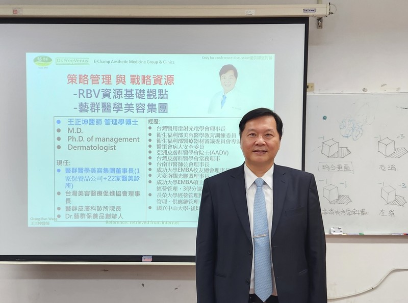 成大高階管理顧問班於4月1日晚間舉辦專題課程,邀請藝群醫學美容集團董事長王正坤醫師擔任講座,於成功大學工設系2樓授課「管理策略與實務-以醫學美容產業為例」,吸引多位企業高階主管與專業經理人到場參與,現場互動熱烈。
