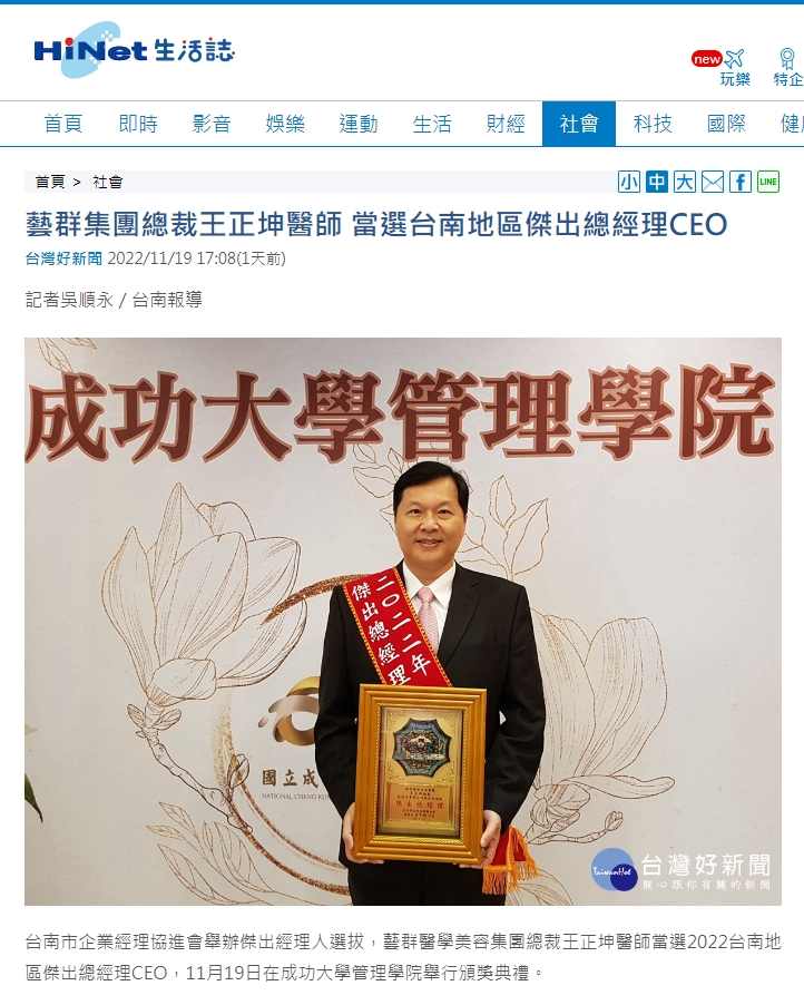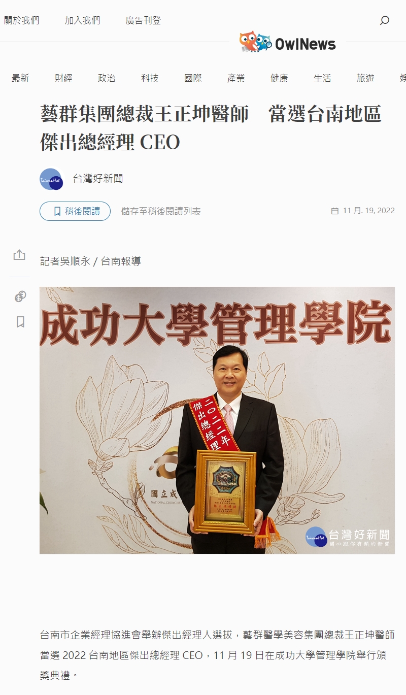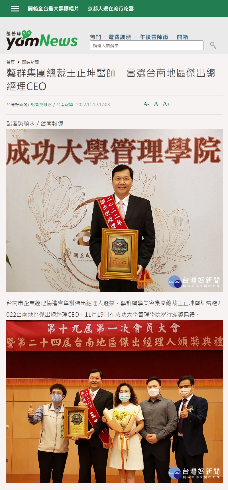 藝群集團總裁王正坤醫師 當選台南地區傑出總經理CEO-Yahoo奇摩新聞-蕃新聞-PChome新聞-HiNet生活誌-OwlNews-台灣好新聞