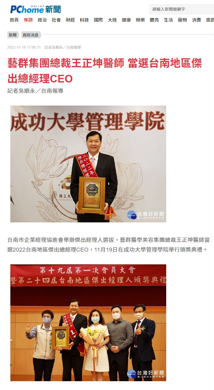 https://www.taiwanhot.net/news/1013379/藝群集團總裁王正坤醫師+當選台南地區傑出總經理CEO -台灣好新聞