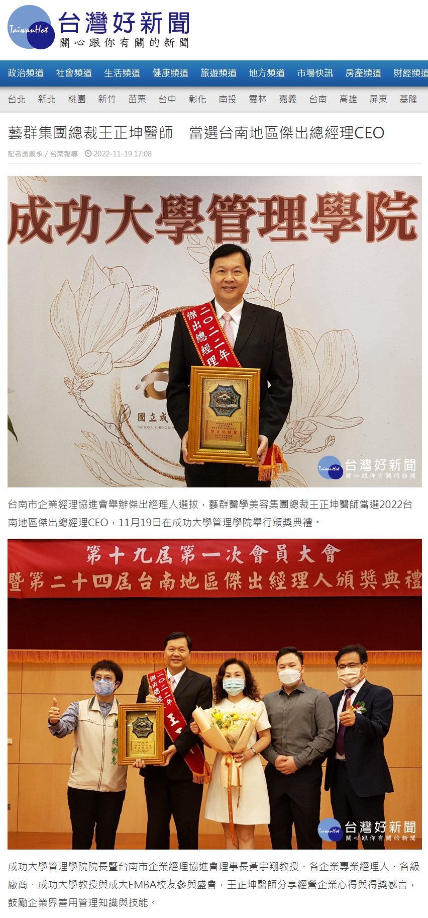 由台南市企業經理協進會舉辦的傑出經理人選拔是台南地區管理學界的一大盛事,選拔含括企劃、行銷、生產、服務等類別的傑出人士,於十九日在成功大學管理學院舉行頒獎典禮,藝群醫學美容集團總裁王正坤也於今年獲選台南地區傑出總經理CEO殊榮。