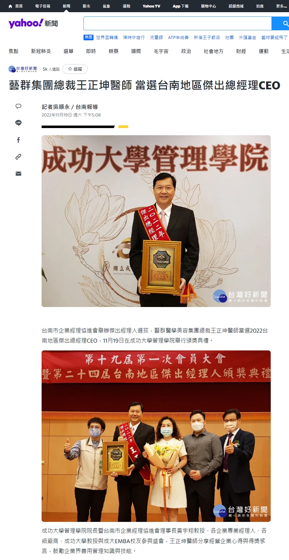 https://tw.news.yahoo.com/藝群集團總裁王正坤醫師-當選台南地區傑出總經理ceo-090831534.html -Yahoo奇摩新聞