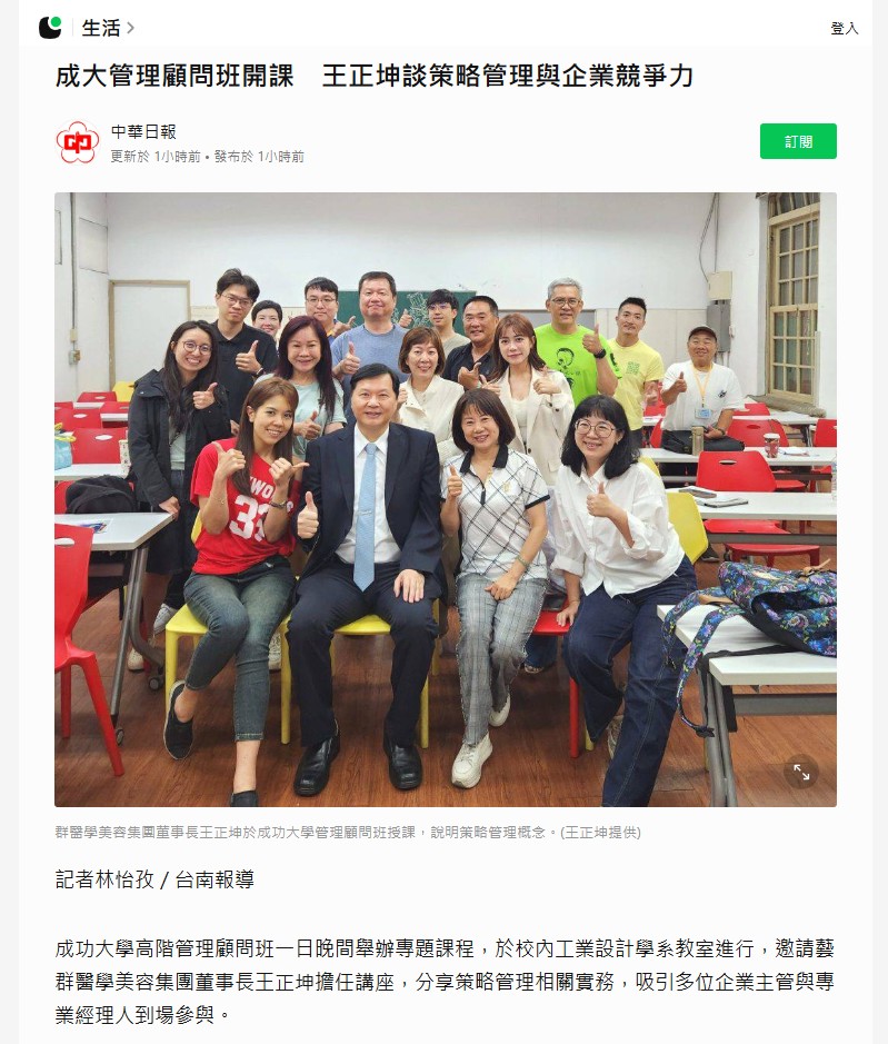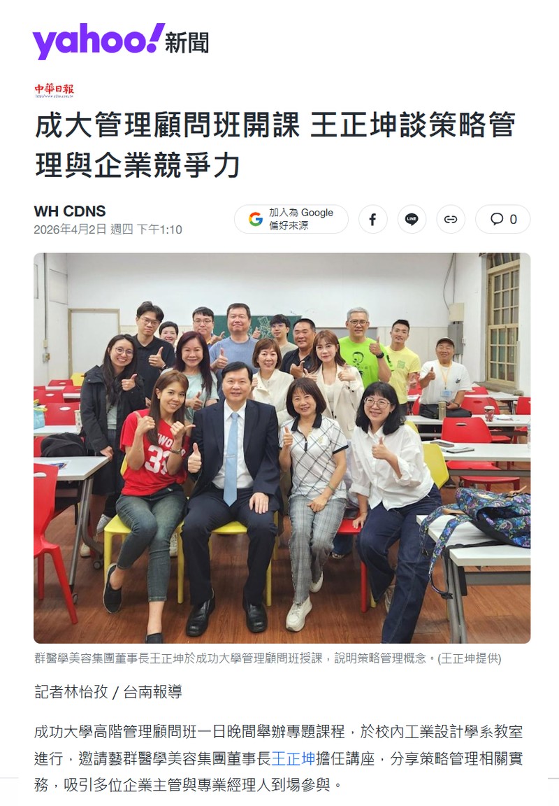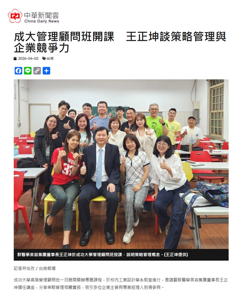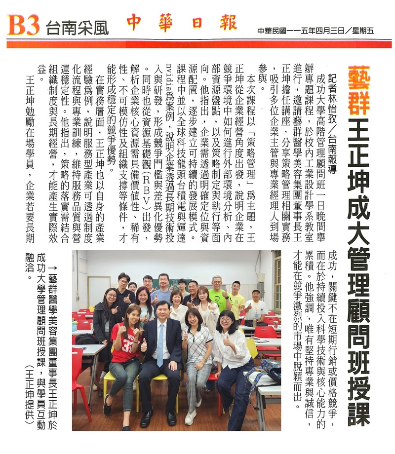 藝群 王正坤成大管理顧問班授課 –中華日報20260403-實體報