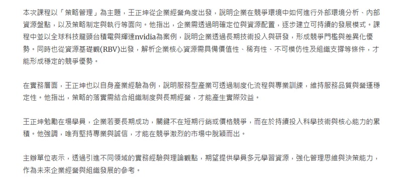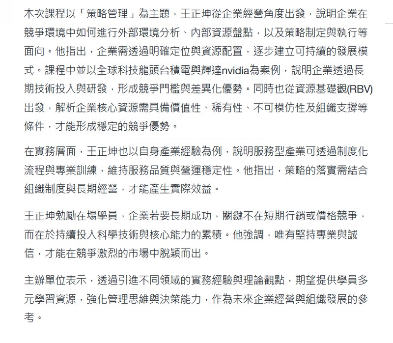 本次課程以「策略管理」為主題,王正坤從企業經營角度出發,說明企業在競爭環境中如何進行外部環境分析、內部資源盤點,以及策略制定與執行等面向。他指出,企業需透過明確定位與資源配置,逐步建立可持續的發展模式。課程中並以全球科技龍頭台積電與輝達nvidia為案例,說明企業透過長期技術投入與研發,形成競爭門檻與差異化優勢。同時也從資源基礎觀(RBV)出發,解析企業核心資源需具備價值性、稀有性、不可模仿性及組織支撐等條件,才能形成穩定的競爭優勢。