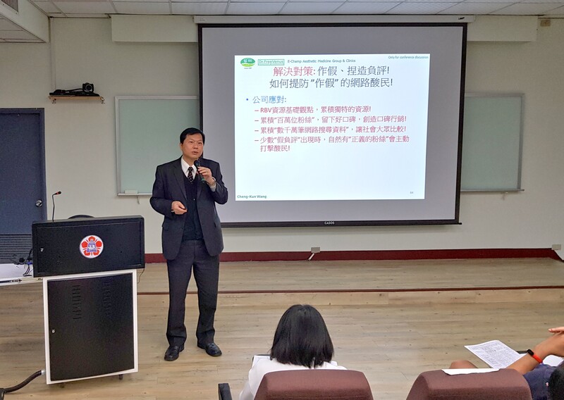 台灣美容醫療促進協會理事長王正坤醫師,現任藝群醫學美容集團總裁,受邀於成功大學開課講授醫學美容,今天特別於課堂上面指導學生如何使用資源基礎理論(RBV)來處理這種網路詐財事件。醫學美容的種類繁多,舉如皮秒雷射、脈衝光、音波拉皮、埋線拉皮、肉毒桿菌素注射除皺、玻尿酸注射除皺等等。在治療過程會形成兩種糾紛,一種是醫療行為有疏失的醫療糾紛,另外一種是醫療行為沒有錯誤,但是消費者與醫師之間摩擦很厲害的消費糾紛。