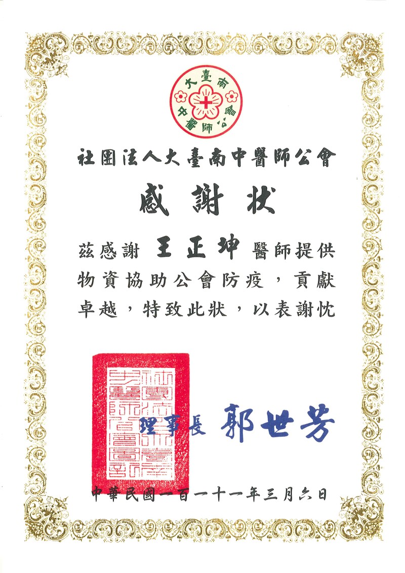 大臺南中醫師公會頒發感謝狀 感謝 王正坤醫師於疫情期間捐助防疫物資
