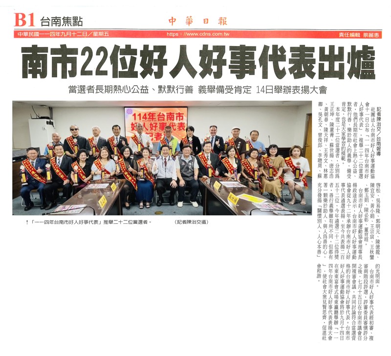 2025/09/12 一一四年南市好人好事代表廿二名出爐 九一四頒獎表揚 -王正坤醫師-YAHOO奇摩新聞-中華日報 一一四年南市好人好事代表廿二名出爐 九一四頒獎表揚 -王正坤醫師-YAHOO奇摩新聞-中華日報 https://tw.news.yahoo.com/四年南市好人好事代表廿二名出爐-九-四頒獎表揚-074056798.html -YAHOO奇摩新聞 https://www.cdns.com.tw/articles/1283768 -中華日報 王正坤醫師帶著藝群眼睛做公益! ...