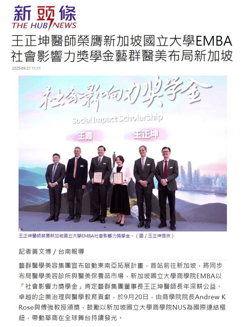 2025/09/23 王正坤醫師榮膺新加坡國立大學EMBA社會影響力獎學金藝群醫美布局新加坡 -新頭條新聞-享新聞-睿傳媒--奧丁丁新聞-yamNews新聞-PChome新聞 王正坤醫師榮膺新加坡國立大學EMBA社會影響力獎學金藝群醫美布局新加坡 -新頭條新聞-享新聞-睿傳媒-在地人新聞 LTVNews-coolbar Life生活誌-GOTHE 走.遊-屏東時報電子報-勢傳媒-奧丁丁新聞-yamNews新聞-PChome新聞 https://www.thehubnews.net/archives/549255 -新頭條新聞 https://i...