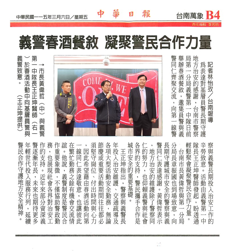 2026/03/05 標題: 警民攜手守護台南 王正坤醫師春酒慰勞台南市警察局第一分局 -1 標題: 警民攜手守護台南 王正坤醫師春酒慰勞台南市警察局第一分局 為慰勞基層員警長期守護地方治安的辛勞,台南市警察局第一分局義警第一中隊長王正坤醫師於3月4日晚間在台南長榮酒店舉辦義警春酒活動。台南市長黃偉哲、警一分局長章振國與義警中隊長王正坤醫師一起上台,向第一線警察同...