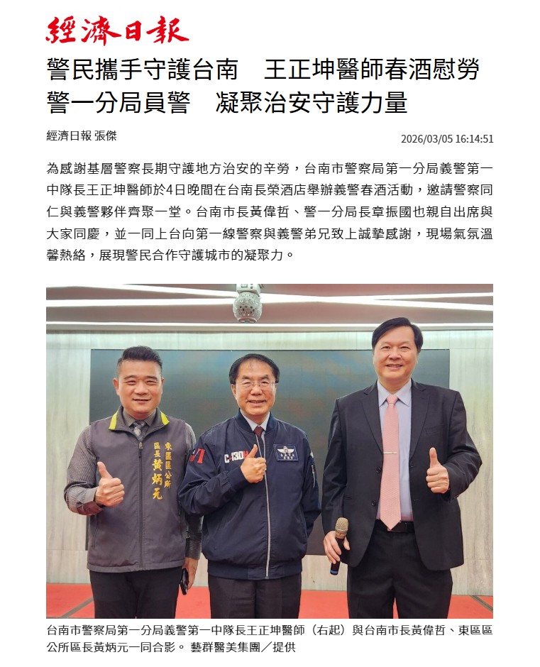 2026/03/06 警民攜手守護台南 王正坤醫師春酒慰勞警一分局員警 凝聚治安守護力量-經濟日報-強勢新聞 警民攜手守護台南 王正坤醫師春酒慰勞警一分局員警 凝聚治安守護力量-經濟日報-強勢新聞 https://money.udn.com/money/story/5635/9361149 -經濟日報 https://jansnews.com.tw/news/3/1442 -強勢新聞 經濟日報 張傑2026/03/05 16:14:51商情I熱門亮點 為感謝基層警察長期守護地方...