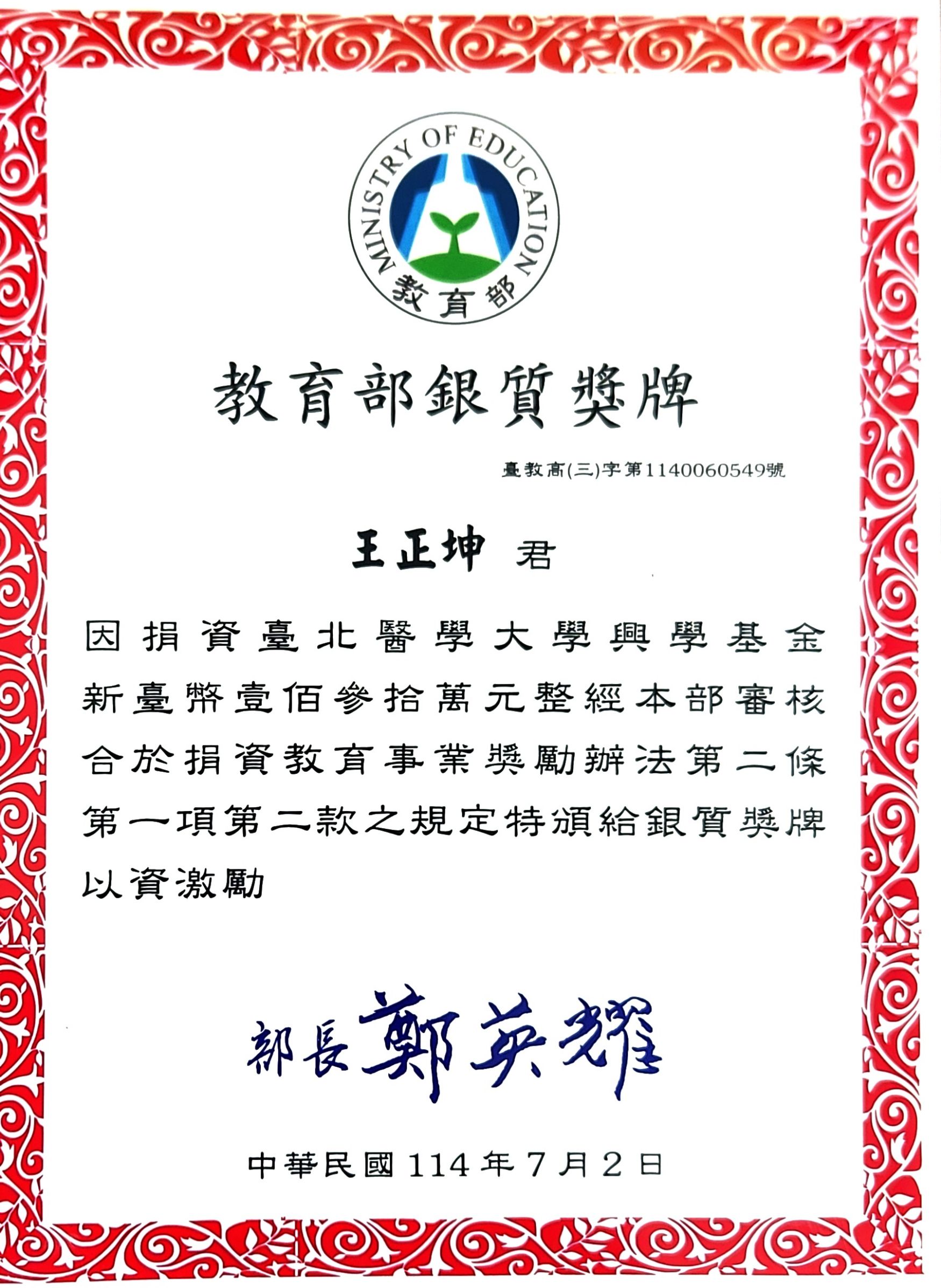 2025/07/02 王正坤醫師 捐資臺北醫學大學興學基金 新臺幣壹佰參拾萬元 獲教育部銀質獎牌 臺教高(三)字第1140060549號 教育部銀質獎牌 臺教高(三)字第1140060549號 王正坤君 因捐資臺北醫學大學興學基金 新臺幣壹佰參拾萬元整經本部審核 合於捐資教育事業獎勵辦法第二條 第一項第二款之規定特頒給銀質獎牌 以資激勵 部長 鄭英耀 中華民國114年7月2日 ----------------------------...