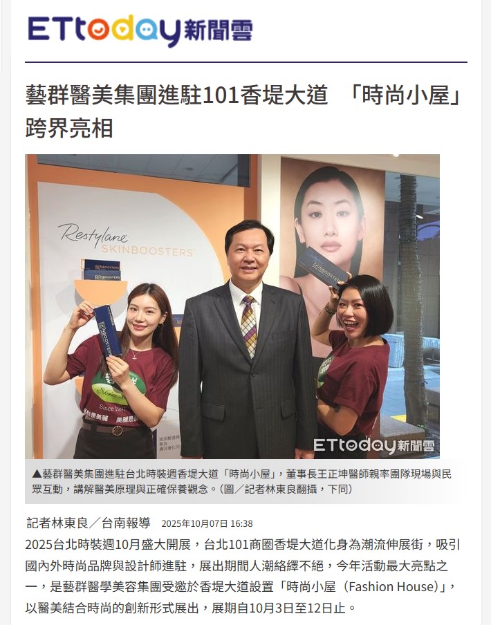 2025/10/07 藝群醫美集團進駐101香堤大道「時尚小屋」跨界亮相 -東森新聞雲-ETtoday新聞雲 藝群醫美集團進駐101香堤大道「時尚小屋」跨界亮相 -東森新聞雲-ETtoday新聞雲 https://www.ettoday.net/news/20251007/3046382.htm 記者林東良/台南報導2025年10月07日 16:38 2025台北時裝週10月盛大開展,台北101商圈香堤大道化身為潮流伸展街,吸引國內外時尚品牌與設計師進駐...