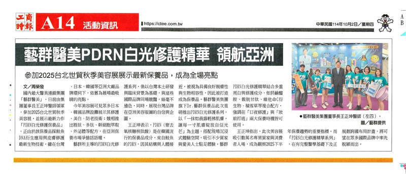 2025/10/03 藝群醫美PDRN白光修護精華 領航亞洲-參加2025台北世貿秋季美容展展示最新保養品,成為全場亮點 -工商時報-奇摩股市-中時新聞網 藝群醫美PDRN白光修護精華 領航亞洲-參加2025台北世貿秋季美容展展示最新保養品,成為全場亮點 -工商時報-奇摩股市-中時新聞網 https://newspaper.ctee.com.tw/share/AA/20251002/A16AA14/1366456 -工商時報 https://www.ctee.com.tw/news/20251002700182-439901 -工商時報 https:/...
