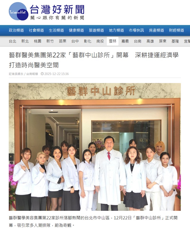 2025/12/22 標題: 藝群醫美集團第22家藝群中山診所開幕 插旗台北中山區商圈 深耕捷運經濟學與醫師人才培育 打造時尚醫美空間-5 標題: 藝群醫美集團第22家藝群中山診所開幕 插旗台北中山區商圈 深耕捷運經濟學與醫師人才培育 打造時尚醫美空間 藝群醫學美容集團第22家診所落腳熱鬧的台北市中山區,於12月22日,第22家分院「藝群中山診所」正式開幕,吸引眾多人潮排隊,蔚為奇觀。診所座落於台北市中山區民權東路,緊鄰...