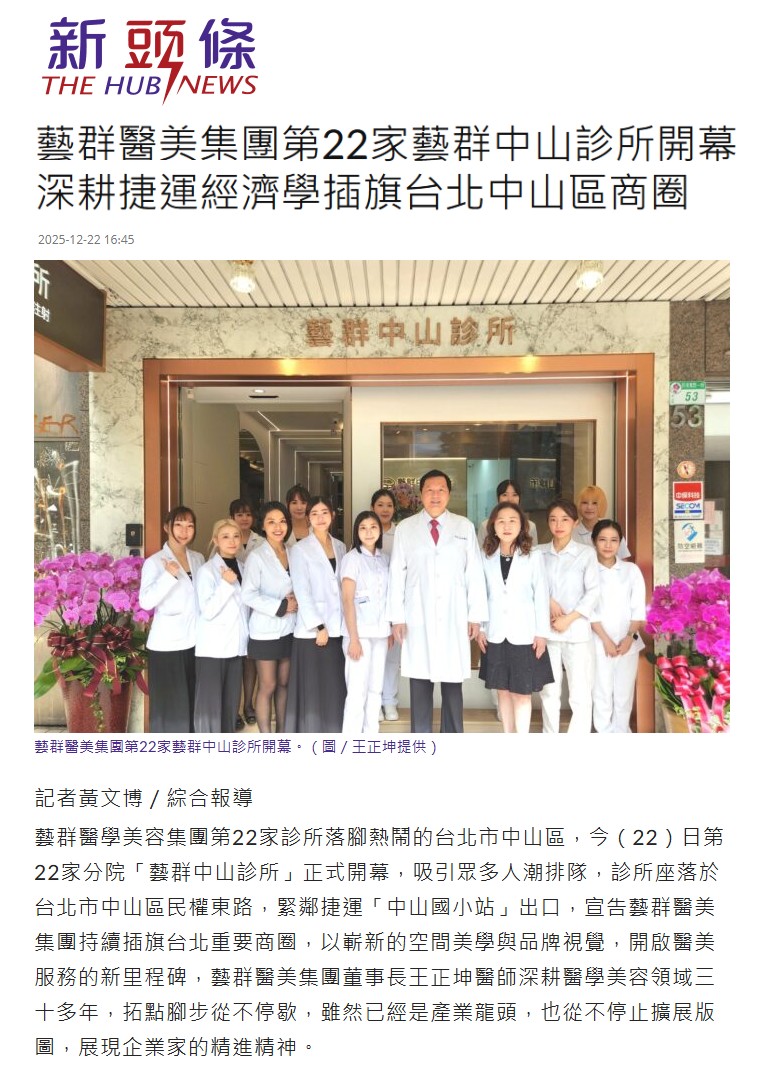 2025/12/23 藝群醫美集團第22家藝群中山診所開幕 深耕捷運經濟學插旗台北中山區商圈 -新頭條新聞-享新聞-睿傳媒-台南時報-yam新聞 蕃薯藤新聞-PChome 新聞 -2 藝群醫美集團第22家藝群中山診所開幕 深耕捷運經濟學插旗台北中山區商圈 -新頭條新聞-享新聞-睿傳媒-奧丁丁新聞-在地人新聞LTVNews-coolbar Life生活誌-GOTHE 走.遊-屏東時報電子報-勢傳媒-台南時報-yam新聞 蕃薯藤新聞-PChome 新聞 https://www.thehubnews.net/archives/581240-新頭條新...