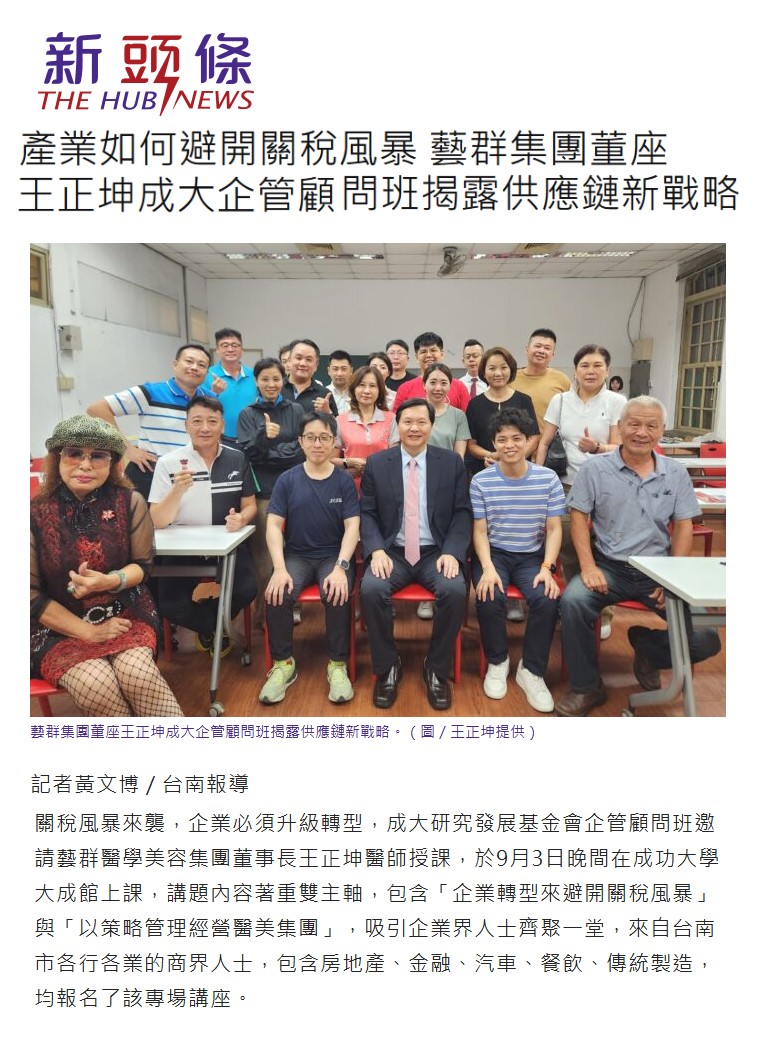2025/09/08 產業如何避開關稅風暴 藝群集團董座王正坤成大企管顧問班揭露供應鏈新戰略 -新頭條新聞-享新聞-睿傳媒-奧丁丁新聞-yamNews新聞-PChome新聞 產業如何避開關稅風暴 藝群集團董座王正坤成大企管顧問班揭露供應鏈新戰略 -新頭條新聞-享新聞-睿傳媒-在地人新聞 LTVNews-屏東時報電子報-coolbar Life生活誌-GOTHE 走.遊-勢傳媒-奧丁丁新聞-yamNews新聞-PChome新聞 https://www.thehubnews.net/archives/543403 -新頭條新聞 https:...