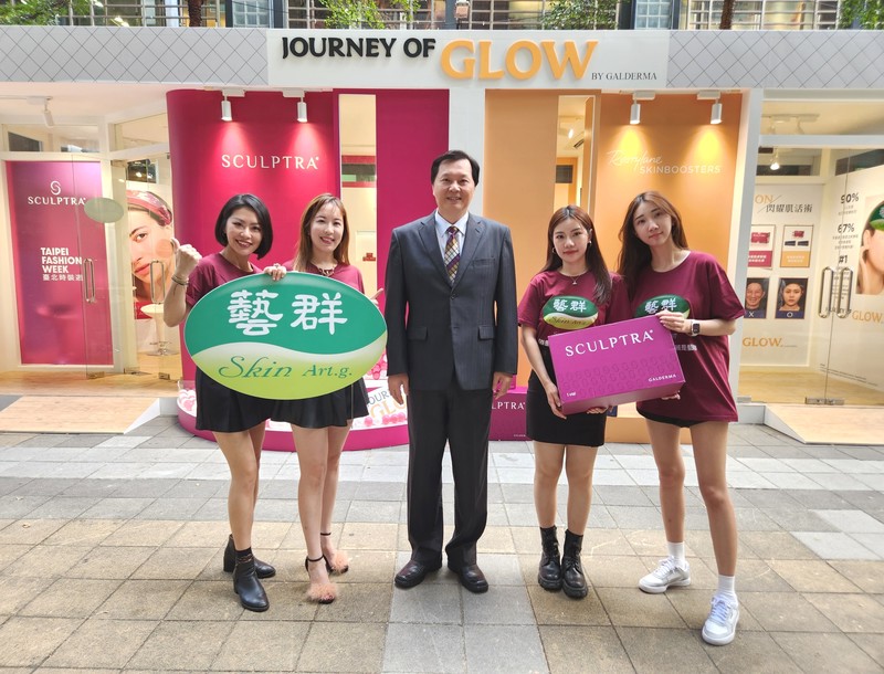 在台北101商圈的香堤大道上,藝群醫美集團以專業元素打造展區,搭配國際醫美品牌Sculptra(舒顏萃)的主視覺,營造出兼具時尚與醫學感的氛圍。街景周圍綠蔭夾道,時尚小屋設於精品商圈中央,展區外牆以「Journey of Glow」為主題,象徵皮膚光輝之旅,從醫學美容出發,邁向健康、自然之美的旅程。