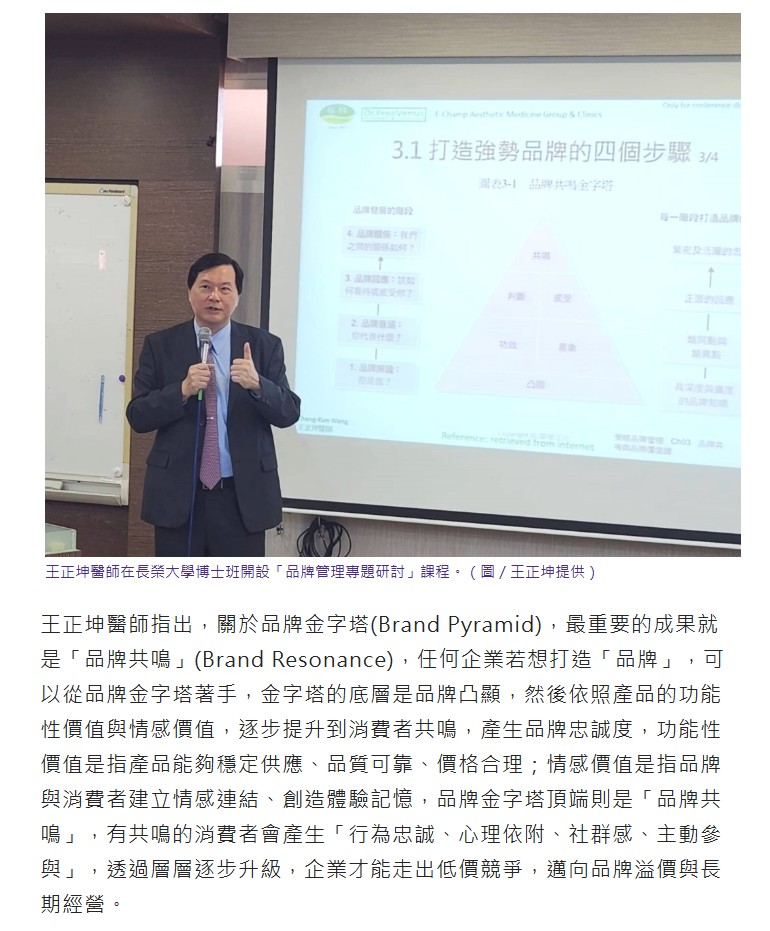 王正坤醫師指出,關於品牌金字塔(Brand Pyramid),最重要的成果就是「品牌共鳴」(Brand Resonance),任何企業若想打造「品牌」,可以從品牌金字塔著手,金字塔的底層是品牌凸顯,然後依照產品的功能性價值與情感價值,逐步提升到消費者共鳴,產生品牌忠誠度,功能性價值是指產品能夠穩定供應、品質可靠、價格合理;情感價值是指品牌與消費者建立情感連結、創造體驗記憶,品牌金字塔頂端則是「品牌共鳴」,有共鳴的消費者會產生「行為忠誠、心理依附、社群感、主動參與」,透過層層逐步升級,企業才能走出低價競爭,邁向品牌溢價與長期經營。
