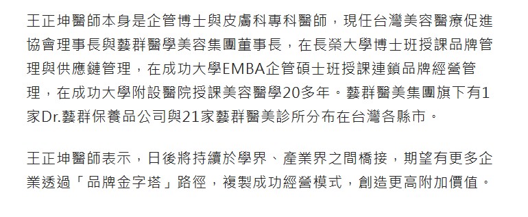 王正坤醫師本身是企管博士與皮膚科專科醫師,現任台灣美容醫療促進協會理事長與藝群醫學美容集團董事長,在長榮大學博士班授課品牌管理與供應鏈管理,在成功大學EMBA企管碩士班授課連鎖品牌經營管理,在成功大學附設醫院授課美容醫學20多年。藝群醫美集團旗下有1家Dr.藝群保養品公司與21家藝群醫美診所分布在台灣各縣市。