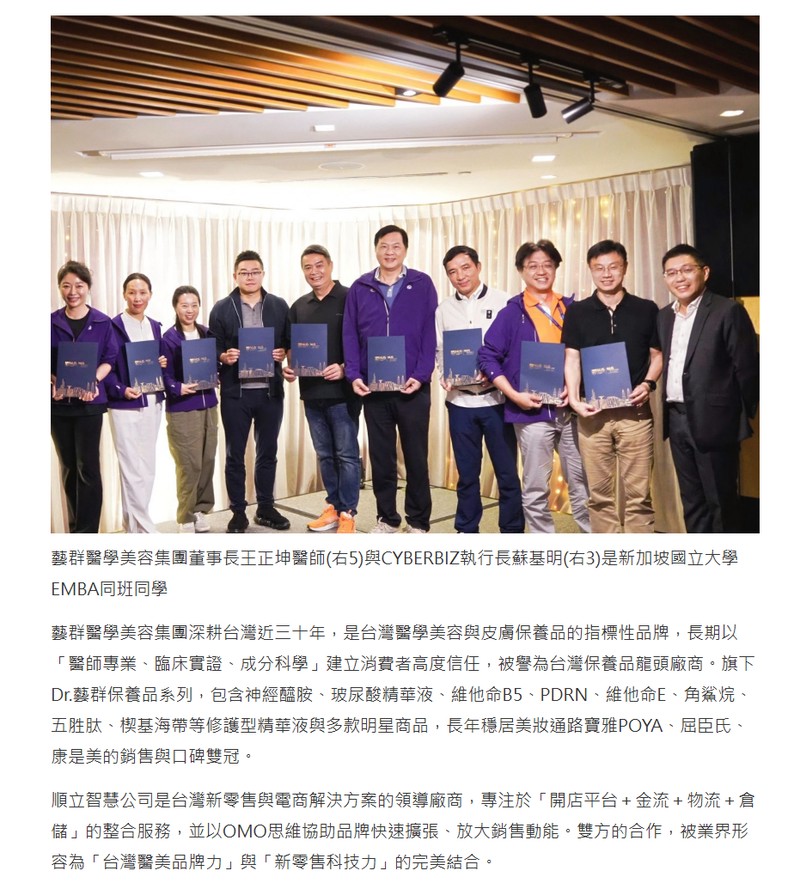 促成此次跨界合作的重要關鍵之一,來自雙方最高領導人之間深厚的同窗情誼與信任。藝群醫學美容集團董事長王正坤醫師與CYBERBIZ執行長蘇基明,同為新加坡國立大學(NUS)商學院EMBA同班同學。NUS長年位居亞洲大學排名第一,是全球華商與企業領袖培育的搖籃,校友遍布亞洲各大產業核心。