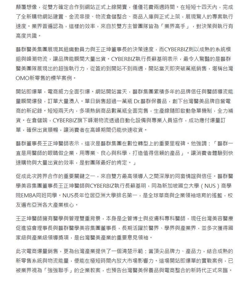 藝群醫美集團展現其組織動員力與王正坤董事長的決策速度,而CYBERBIZ則以成熟的系統模組與峰潮物流,讓品牌能瞬間大量出貨。CYBERBIZ執行長蘇基明表示,最令人驚豔的是藝群醫美團隊展現出的超強執行力,從簽約到開站不到兩週,開站當天即突破萬瓶銷售,堪稱台灣OMO新零售的標竿案例。