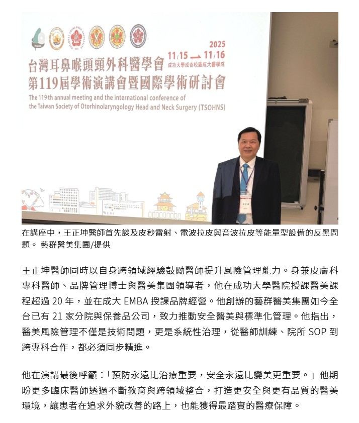 王正坤醫師同時以自身跨領域經驗鼓勵醫師提升風險管理能力。身兼皮膚科專科醫師、品牌管理博士與醫美集團領導者,他在成功大學醫院授課醫美課程超過 20 年,並在成大 EMBA 授課品牌經營。他創辦的藝群醫美集團如今全台已有 21 家分院與保養品公司,致力推動安全醫美與標準化管理。他指出,醫美風險管理不僅是技術問題,更是系統性治理,從醫師訓練、院所 SOP 到跨專科合作,都必須同步精進。