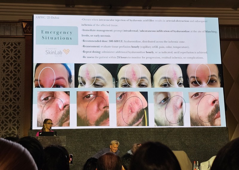 世界美容醫學大會AMWC於10月1日到3日在杜拜舉行,藝群醫學美容集團董事長王正坤醫師受邀出席。本屆的醫美副作用專題演講,各國醫師都聚焦在注射除皺安全與併發症防治。王正坤醫師指出,注射玻尿酸或其他填充物去除臉部皺紋時,最常見血管栓塞的三大高風險區域為鼻尖、法令紋與嘴唇,醫師必須提高警覺。當填充物阻塞血管時,常導致皮膚缺血、變黑、化膿、潰爛,甚至導致眼睛失明。而治療這些副作用的解藥為玻尿酸降解酶(hyaluronidase)。