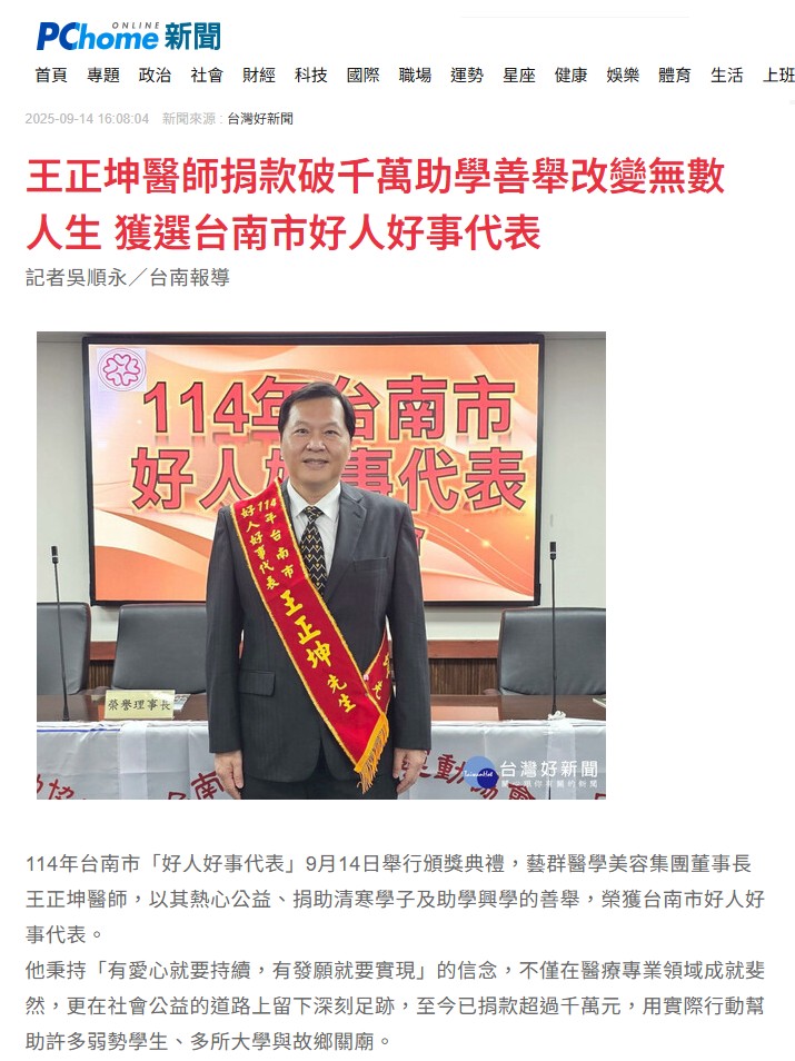 114年台南市「好人好事代表」9月14日舉行頒獎典禮,藝群醫學美容集團董事長王正坤醫師,以其熱心公益、捐助清寒學子及助學興學的善舉,榮獲台南市好人好事代表。