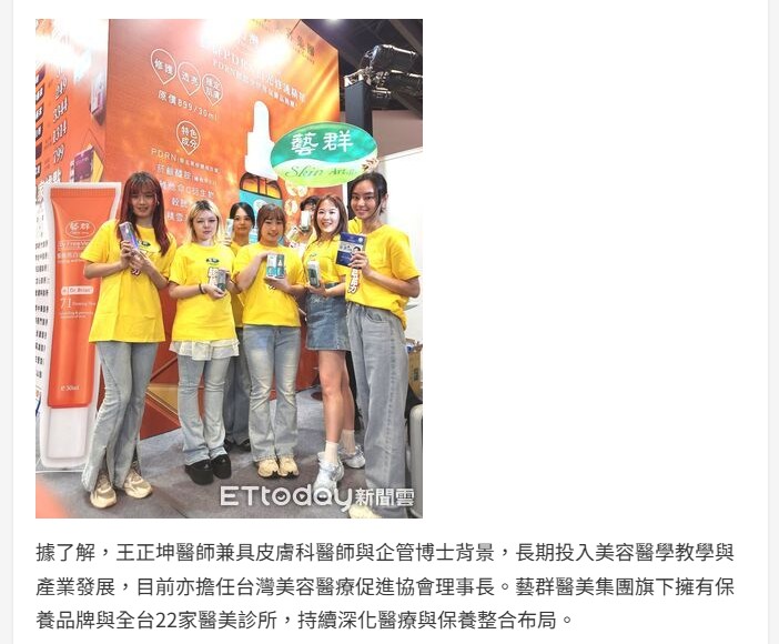 據了解,王正坤醫師兼具皮膚科醫師與企管博士背景,長期投入美容醫學教學與產業發展,目前亦擔任台灣美容醫療促進協會理事長。藝群醫美集團旗下擁有保養品牌與全台22家醫美診所,持續深化醫療與保養整合布局。