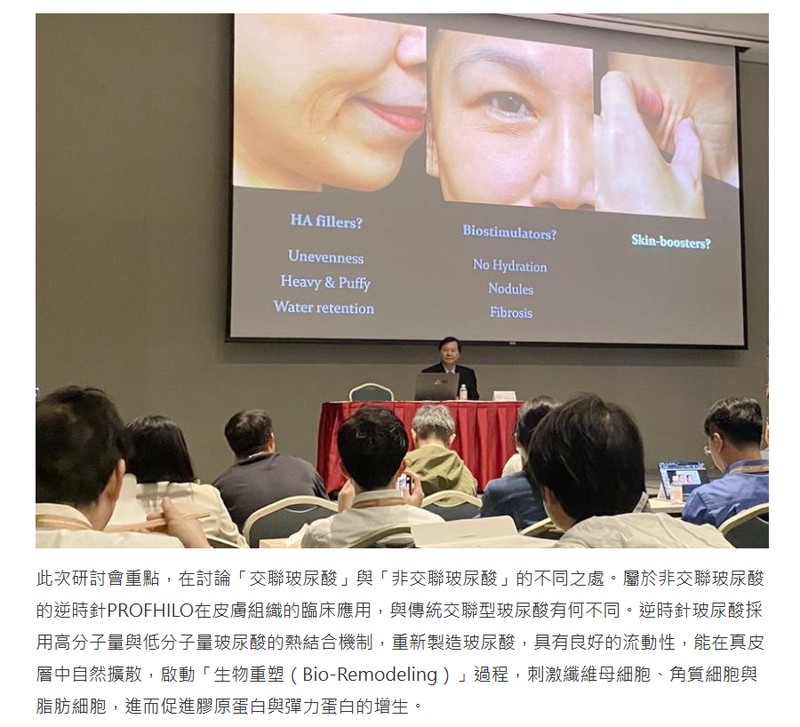 此次研討會重點,在討論「交聯玻尿酸」與「非交聯玻尿酸」的不同之處。屬於非交聯玻尿酸的逆時針PROFHILO在皮膚組織的臨床應用,與傳統交聯型玻尿酸有何不同。逆時針玻尿酸採用高分子量與低分子量玻尿酸的熱結合機制,重新製造玻尿酸,具有良好的流動性,能在真皮層中自然擴散,啟動「生物重塑(Bio-Remodeling)」過程,刺激纖維母細胞、角質細胞與脂肪細胞,進而促進膠原蛋白與彈力蛋白的增生。
