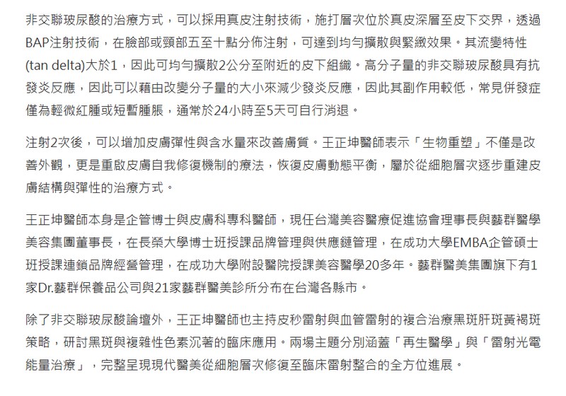 台灣皮膚科醫學會第51屆年會於年11月8日至9日,在台北國際會議中心盛大舉行。邀請藝群醫學美容集團董事長王正坤醫師擔任座長與主持人,分別主持「非交聯玻尿酸生物重塑研討會」及「皮秒雷射與血管雷射複合治療黑斑肝斑研討會」兩場研討會,展現其在再生醫學與臨床雷射醫學領域的重要地位。