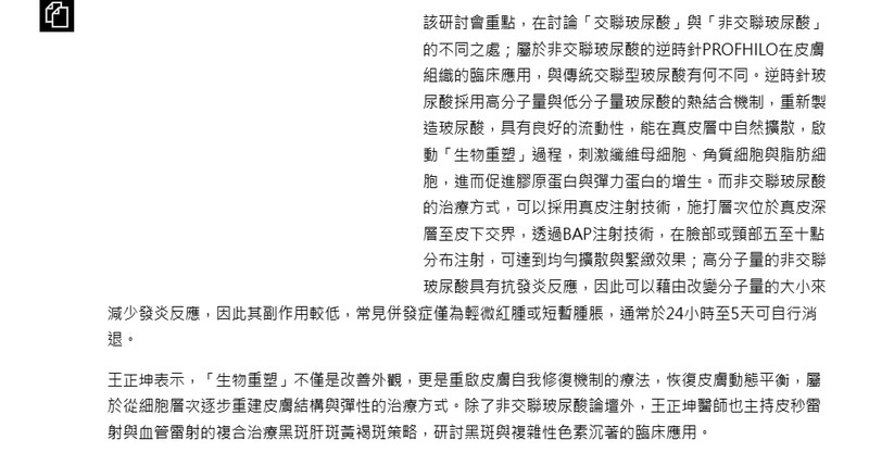 該研討會重點,在討論「交聯玻尿酸」與「非交聯玻尿酸」的不同之處;屬於非交聯玻尿酸的逆時針PROFHILO在皮膚組織的臨床應用,與傳統交聯型玻尿酸有何不同。逆時針玻尿酸採用高分子量與低分子量玻尿酸的熱結合機制,重新製造玻尿酸,具有良好的流動性,能在真皮層中自然擴散,啟動「生物重塑」過程,刺激纖維母細胞、角質細胞與脂肪細胞,進而促進膠原蛋白與彈力蛋白的增生。而非交聯玻尿酸的治療方式,可以採用真皮注射技術,施打層次位於真皮深層至皮下交界,透過BAP注射技術,在臉部或頸部五至十點分布注射,可達到均勻擴散與緊緻效果;高分子量的非交聯玻尿酸具有抗發炎反應,因此可以藉由改變分子量的大小來減少發炎反應,因此其副作用較低,常見併發症僅為輕微紅腫或短暫腫脹,通常於24小時至5天可自行消退。