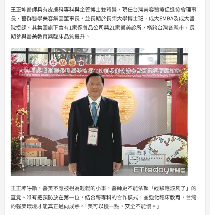 王正坤醫師具有皮膚科專科與企管博士雙背景,現任台灣美容醫療促進協會理事長、藝群醫學美容集團董事長,並長期於長榮大學博士班、成大EMBA及成大醫院授課。其集團旗下含有1家保養品公司與21家醫美診所,橫跨台灣各縣市,長期參與醫美教育與臨床品質提升。