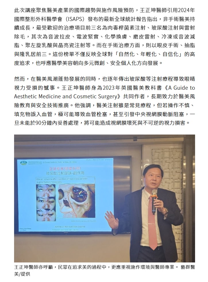 然而,在醫美風潮蓬勃發展的同時,也逐年傳出玻尿酸等注射療程導致眼睛視力受損的憾事。王正坤醫師身為2023年英國醫美教科書《A Guide to Aesthetic Medicine and Cosmetic Surgery》共同作者,長期致力於醫美風險教育與安全技術推廣。他強調,醫美注射雖是常見療程,但若操作不慎、填充物誤入血管,極可能導致血管栓塞,甚至引發中央視網膜動脈阻塞,一旦未能於90分鐘內妥善處理,將可能造成視網膜壞死與不可逆的視力損害。