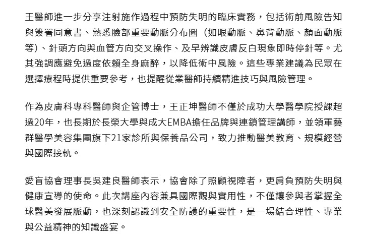 王正坤醫師應邀愛盲協會專題講座 分享全球醫美趨勢與眼部安全風險防範 -經濟日報